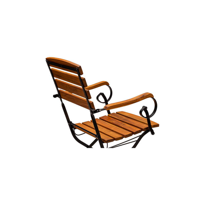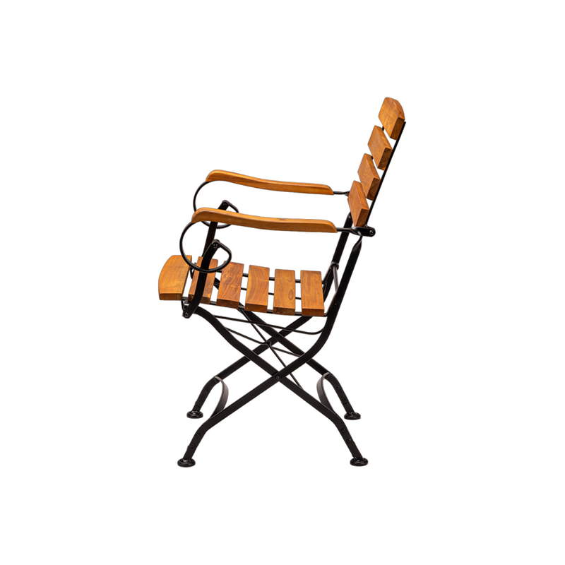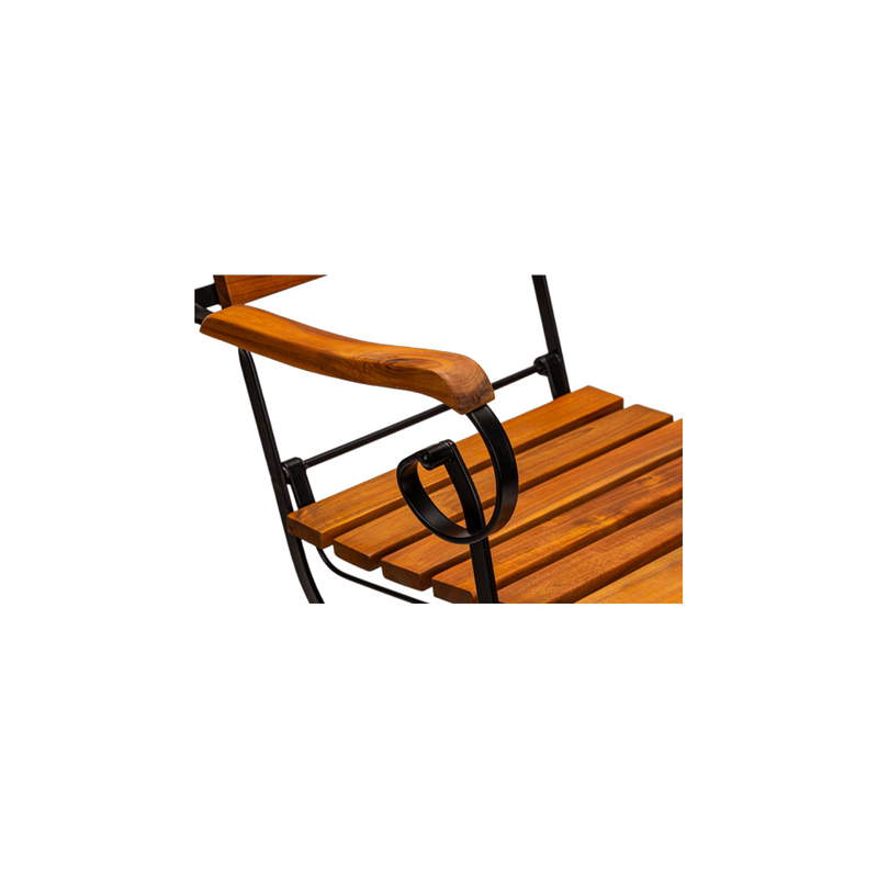 Komfortabler und klappbarer Biergartenstuhl LARA Grand mit pulverbeschichtetem Stahlgestell und wetterfesten Akazienholzlatten – inklusive Armlehnen für maximalen Sitzkomfort.