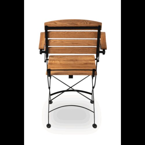 Robuster Biergartenstuhl Linda Grand, aus Eschenholz und Stahl, perfekt für den Außenbereich bis 150 kg belastbar.