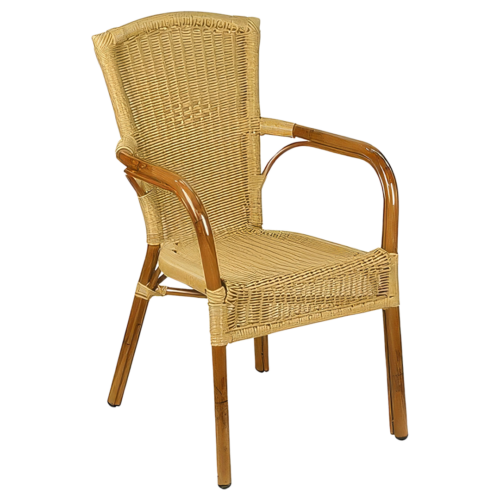 Der Stuhl besteht aus wetterfestem, robustem Kunststoffgeflecht (Polyrattan) in Natur-Optik, kombiniert mit einem stabilen Aluminiumrahmen. Diese Materialien machen ihn leicht, rostfrei und langlebig – ideal für ganzjährigen Außeneinsatz.