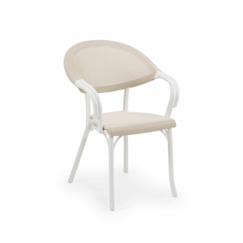 Flash-N kombiniert eine textile Rückenpartie mit einem UV-beständigen Kunststoffrahmen und ist somit bestens geeignet für den langfristigen Außeneinsatz. Die Sitz- und Rückenfläche ist mit einer doppelten PVC-Netzstruktur versehen, die sowohl ästhetisch wirkt als auch bei hohen Temperaturen atmungsaktiv bleibt. Das milchweiße Gestell verleiht dem Stuhl eine frische und moderne Optik – harmonisch und vielseitig einsetzbar.