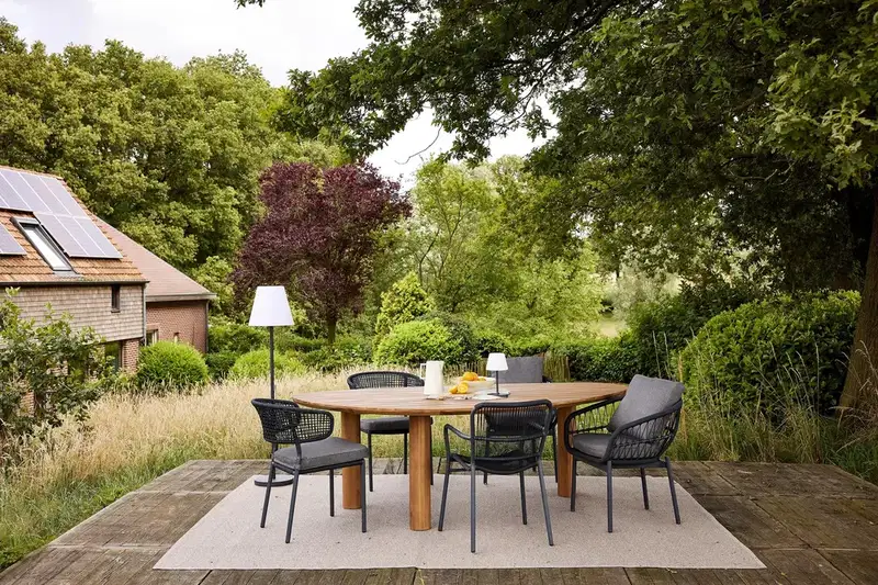 Dank seines durchdachten Designs bietet der Stuhl eine unterstützende und ergonomische Sitzhaltung, die ihn sowohl funktional als auch ästhetisch ansprechend macht. Er fügt sich in jedes Outdoor-Umfeld ein – ob Café-Terrasse, Hotelgarten oder privater Essbereich.