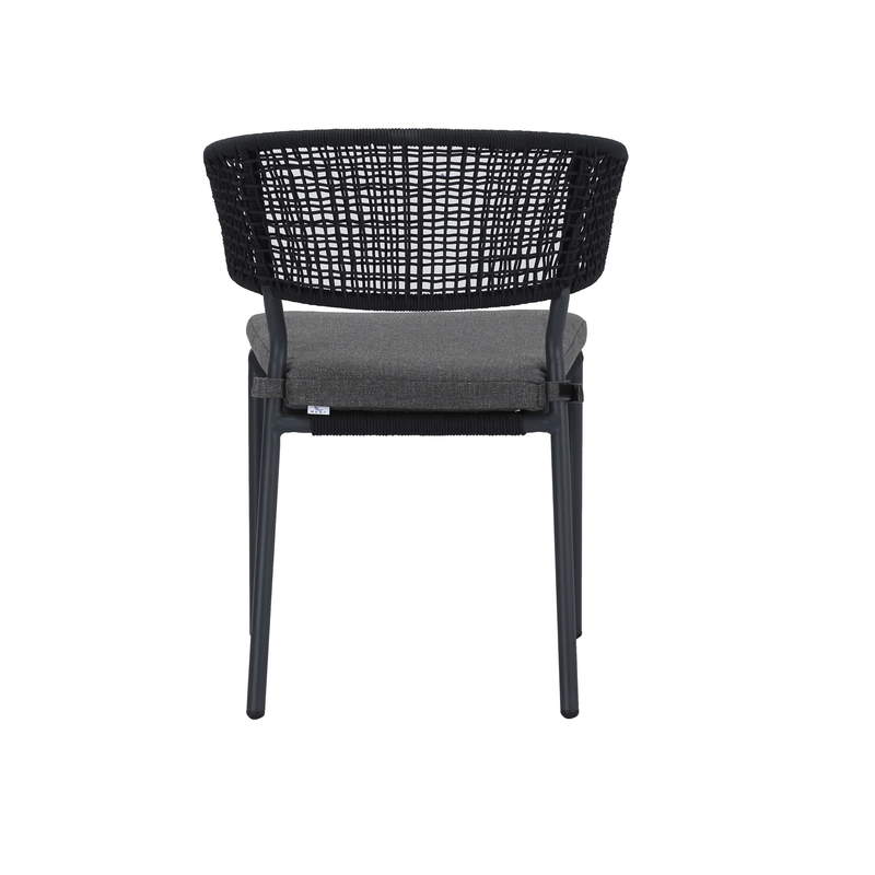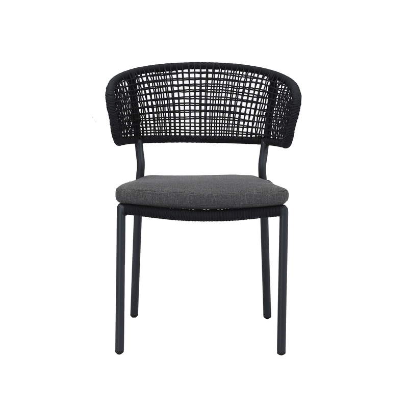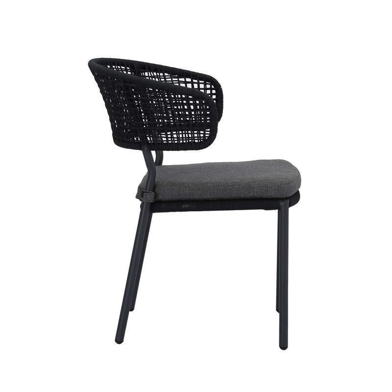 Das Gestell aus robustem Stahl sorgt für Stabilität und eine lange Lebensdauer, selbst bei intensiver Nutzung im professionellen Außenbereich. Die Sitz- und Rückenfläche bestehen aus witterungsbeständigem Seilgeflecht, das flexibel, bequem und strapazierfähig zugleich ist.
