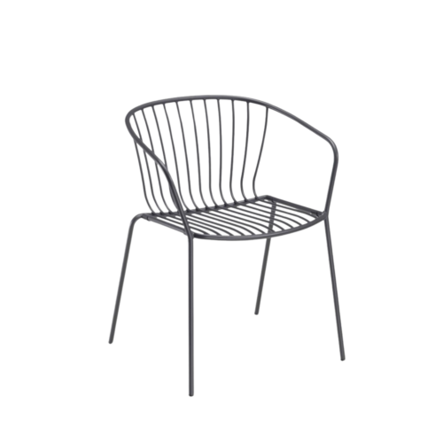 Stuhl Amitha Grau mit Armlehne – Ein eleganter, stapelbarer Metallstuhl mit Armlehne für den Außenbereich, ideal für stilvolle Gärten und Terrassen.
