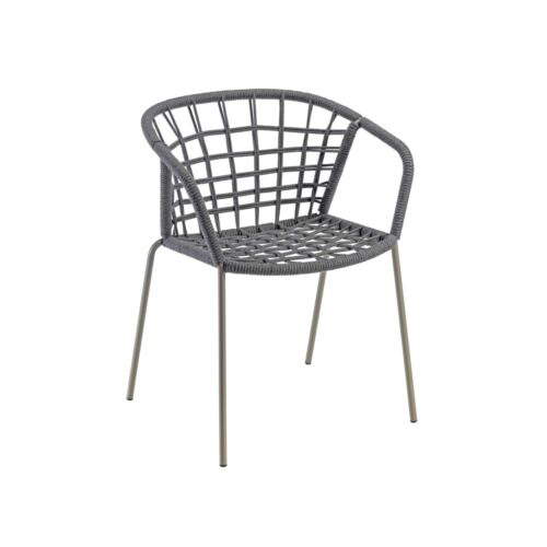 Der Stuhl Sanela mit Armlehne kombiniert anthrazitfarbenes Seilgeflecht und einen schwarzen Metallrahmen, was ihn zu einer robusten und eleganten Wahl für den Außenbereich macht.