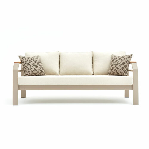• Farben: Das Gestell in Sand wird durch cremefarbene Sitzkissen und dekorative gelbe Kissen ergänzt, die für stilvolle Akzente sorgen.