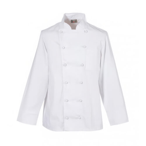 Entdecken Sie die Langarm Unisex Kochjacke in Weiß – ideal für lange Stunden in der Küche, mit praktischer Brusttasche und bequemer Passform.