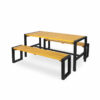 Die Garnitur besteht aus massivem Kiefernholz mit einer Arbeitsplatten- bzw. Sitzstärke von 40 mm und einer Profilstärke von 2 mm. Diese Kombination sorgt für eine sehr hohe Stabilität und Belastbarkeit – ideal für den intensiven Einsatz in Gastronomie und Eventbereich.