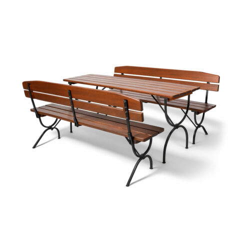Ein Tisch (180×60×79 cm) und zwei Bänke (180×36×47,5 cm) – beide Bänke mit Rückenlehne.