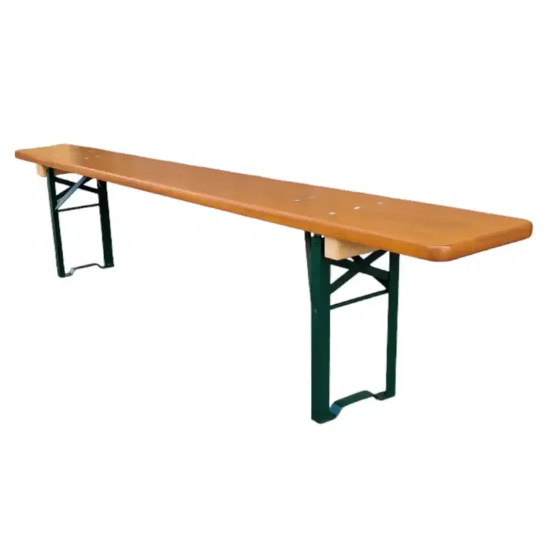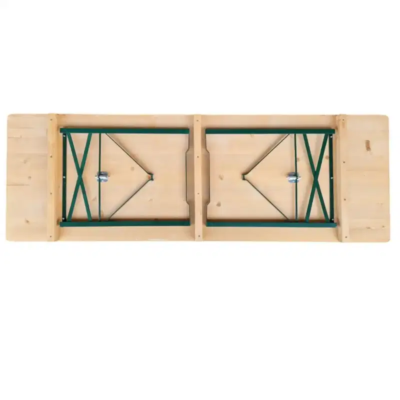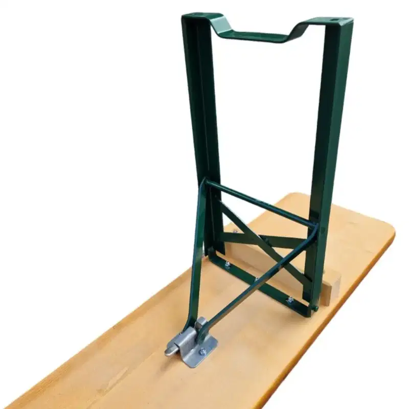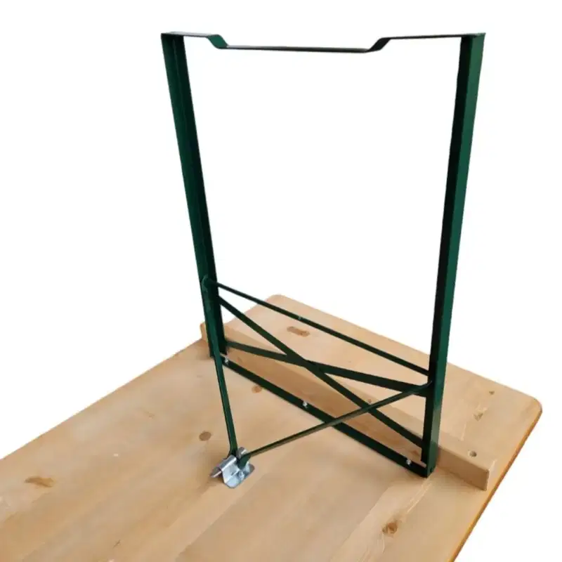 Das Gestell besteht aus 3 mm starkem Winkeleisen, das galvanisch verzinkt und grün pulverbeschichtet ist. Diese hochwertige Verarbeitung schützt vor Rost und garantiert Stabilität und Standfestigkeit. Dank der praktischen Schnäpper bleiben Tisch und Bänke sicher in Position und lassen sich dennoch schnell und platzsparend zusammenklappen.