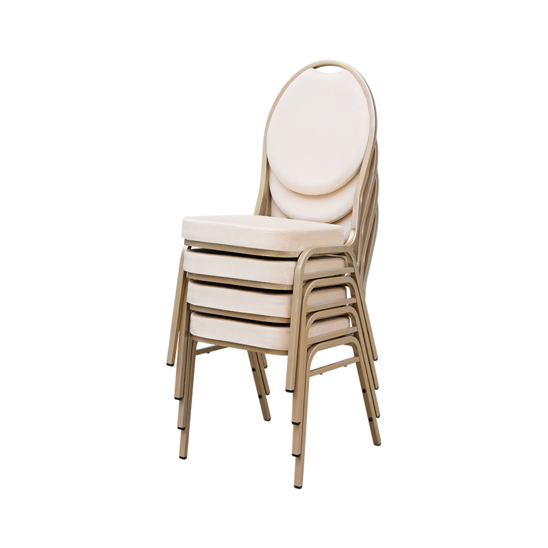 Eleganter, stapelbarer Bankettstuhl für Hotels, Restaurants und Eventlocations. Hochwertiger Veloursbezug (210 g/m²), robuster Stahlrahmen in Goldoptik, bis zu 19-fach stapelbar und bis 200 kg belastbar – ideal für den professionellen HoReCa-Einsatz