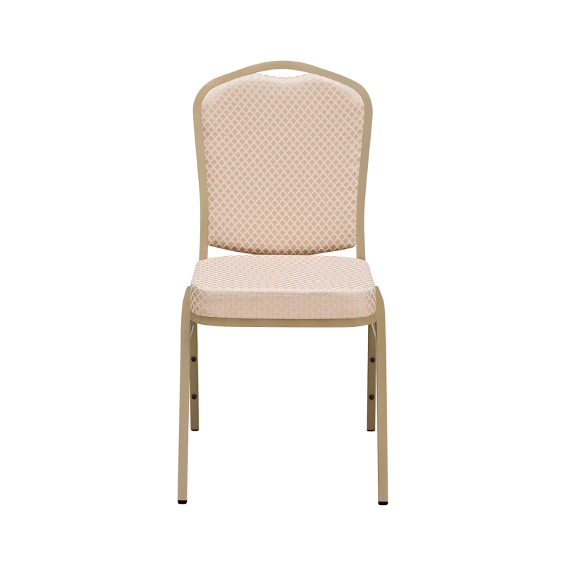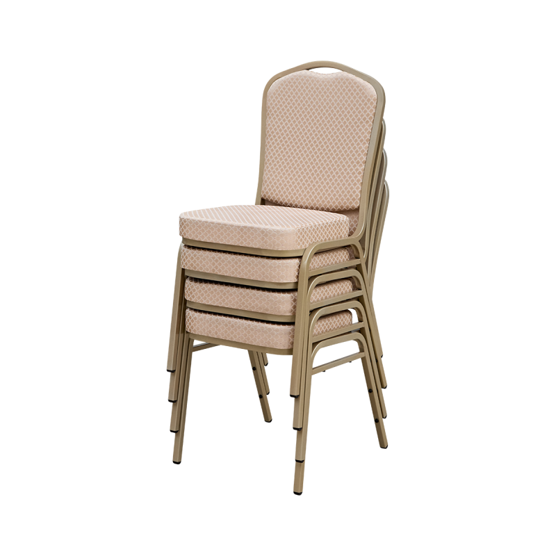 Stapelbarer Bankettstuhl für Gastronomie, Hotels und Eventlocations. Komfortables Sitzpolster mit 5,5 cm formstabilem Schaumstoff, elegantes Stahlgestell in Champagnergold, bis zu 18-fach stapelbar und bis 200 kg belastbar – ideal für professionelle HoReCa-Bereiche.