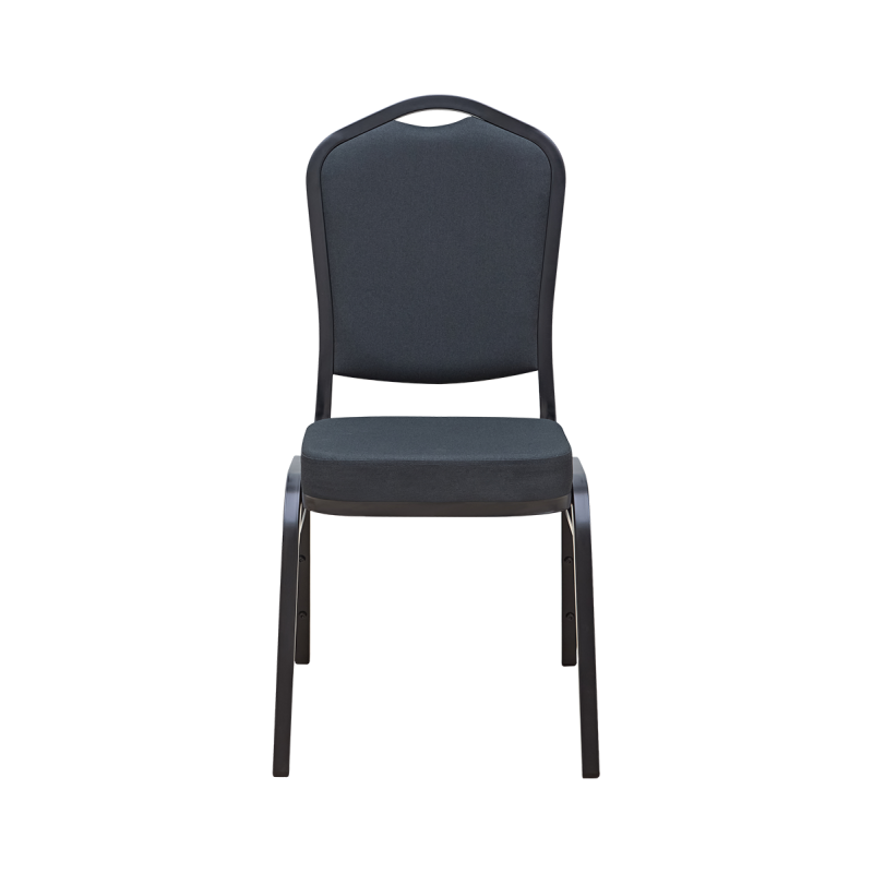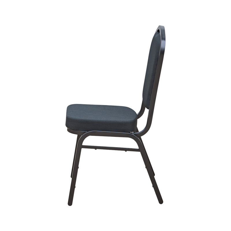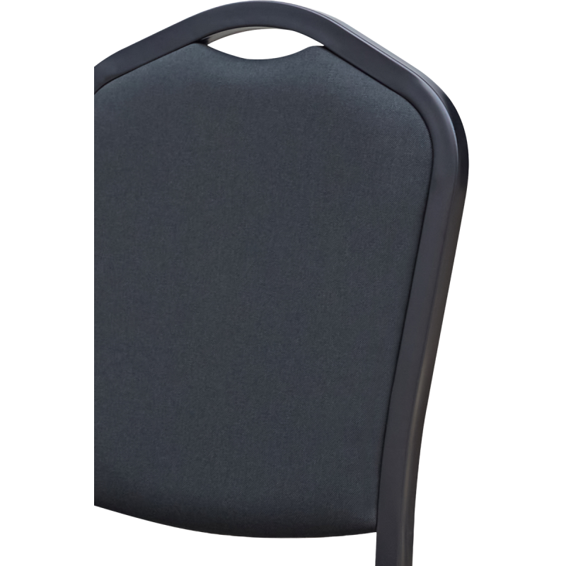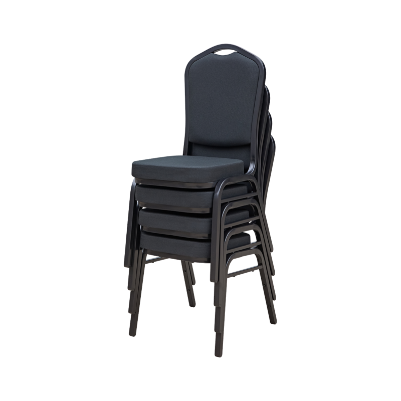 Moderner, stapelbarer Bankettstuhl für Gastronomie, Hotels und Eventlocations. Schwarze Polsterung, formstabiles Sitzpolster (5,5 cm), robustes matt-schwarzes Stahlgestell, bis zu 18-fach stapelbar und bis 200 kg belastbar – ideal für professionelle HoReCa-Bereiche und Business-Events.