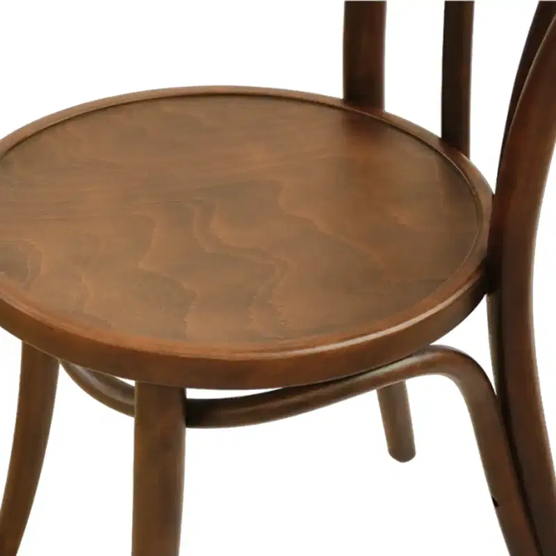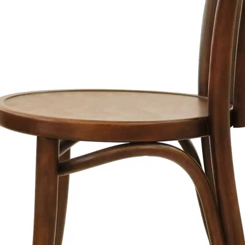 Der Stuhl wird aus gebogenem Buchenholz gefertigt und in Nussbaum-Finish angeboten.