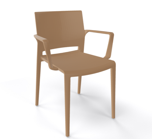 Der Stuhl Bakhita Braun mit Armlehne überzeugt durch modernes Design, hohen Komfort und vielseitige Einsatzmöglichkeiten in Innen- und Außenbereichen.