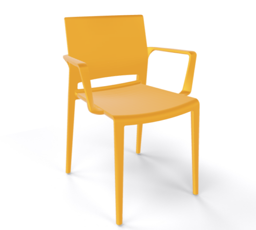 Der Stuhl Bakhita Safran mit Armlehne überzeugt durch modernes Design, hohen Komfort und vielseitige Einsatzmöglichkeiten in Innen- und Außenbereichen.