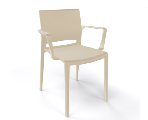 Der Stuhl Bakhita Sand mit Armlehne überzeugt durch modernes Design, hohen Komfort und vielseitige Einsatzmöglichkeiten in Innen- und Außenbereichen.