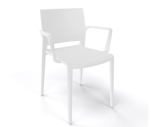 Der Stuhl Bakhita Weiß mit Armlehne überzeugt durch modernes Design, hohen Komfort und vielseitige Einsatzmöglichkeiten in Innen- und Außenbereichen.