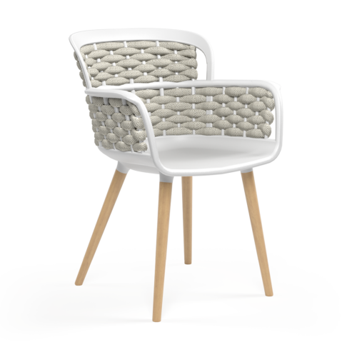 Der Stuhl Eva-N Geflecht Milchweiß & Beige kombiniert stilvolle Eleganz mit robuster Funktionalität, ideal für den Innen- und Außenbereich.
