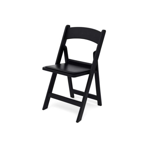 Eleganter, klappbarer Hochzeitsstuhl in Schwarz aus robustem Polycarbonat. Wetterbeständig, stapelbar und mit gepolsterter Sitzfläche für hohen Komfort – perfekt für Hochzeiten, Events, Catering und Vermietungen.