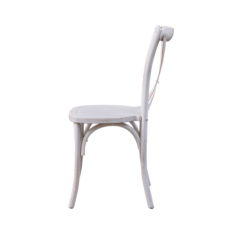 Bringen Sie romantisches Flair und klassische Eleganz in jede Hochzeitslocation: Der CROSS-BACK WOOD Hochzeitsstuhl in gealtertem Weiß überzeugt durch sein ikonisches Kreuzrückendesign und eine aufwendig handgefertigte Konstruktion aus hochwertigem Massivholz. Die weiß gealterte Oberfläche verleiht dem Stuhl einen charmanten Vintage-Look, der sowohl rustikale als auch elegante Dekorationen stilvoll ergänzt.