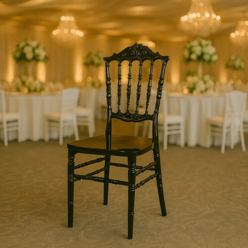 Der Hochzeitsstuhl Elite kombiniert zeitlose Eleganz mit außergewöhnlicher Stabilität und ist damit die ideale Wahl für exklusive Hochzeiten, stilvolle Bankette und gehobene Veranstaltungen. In der edlen Farbe Schwarz verleiht er jedem Ambiente eine luxuriöse Note. Seine glänzende Oberfläche und die fein verzierten Details der Rückenlehne machen ihn zu einem echten Blickfang.
