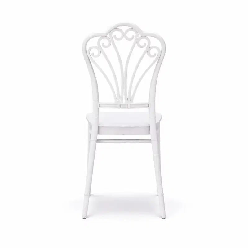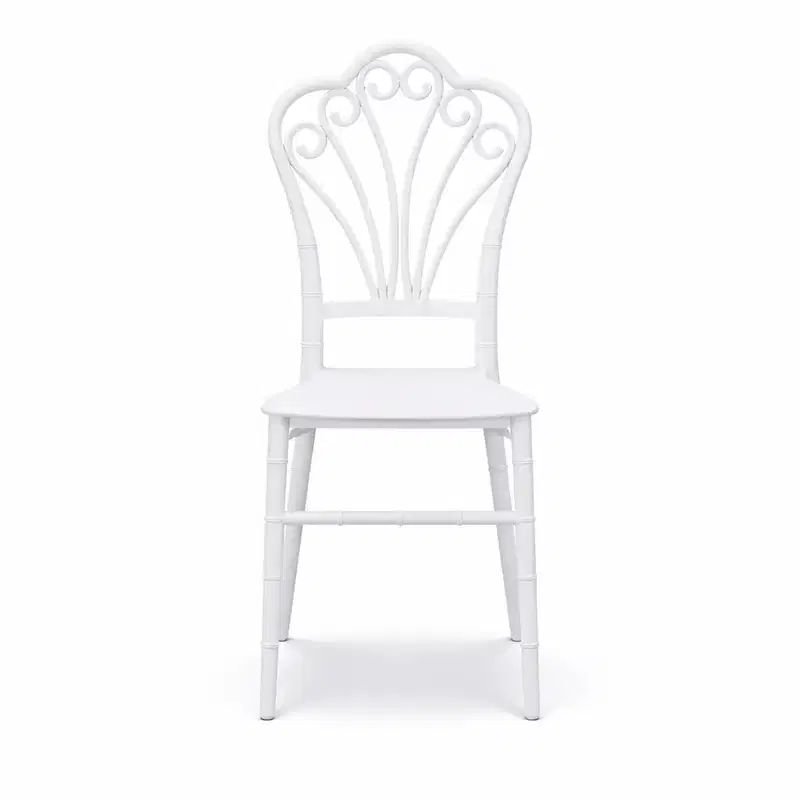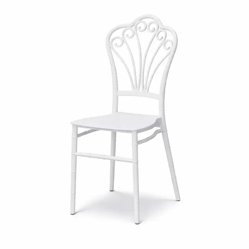Der weiße Hochzeitsstuhl Victoria Simple besticht durch sein zeitloses Design und eine langlebige, stapelbare Bauweise aus Polypropylen für exklusive Events.