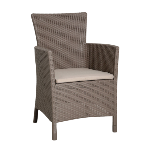 Entdecken Sie den komfortablen „Dining-Sessel Napoli Cappuccino“ mit eleganter Geflechtoptik und praktischem Sitzkissen.