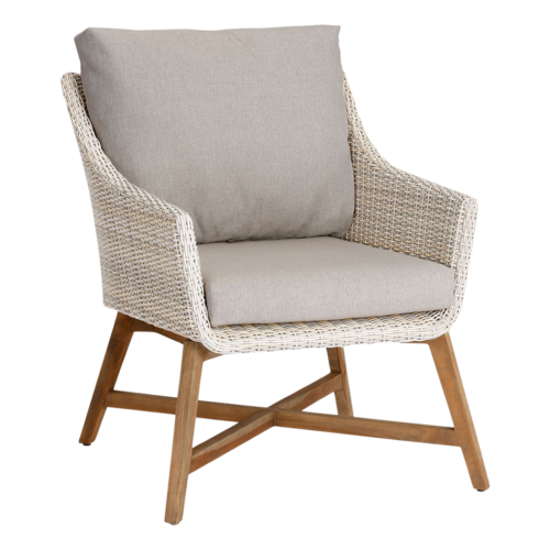 Entdecken Sie den Lounge-Sessel Paterna aus Teakholz und Alabaster mit hohem Komfort und stilvollem Design. Ideal für jede Wetterlage.