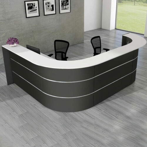Die anthrazitfarbene Front wird durch dekorative Edelstahlstreifen (20 mm hoch) optisch aufgelockert, was der Theke eine stilvolle und moderne Ausstrahlung verleiht. Die leicht gebogene Form der Theke sorgt für eine offene und einladende Gestaltung des Empfangsbereichs. Mit einer Höhe von 1120 mm bietet die Theke eine ideale Arbeitshöhe für die Interaktion mit Kunden und Besuchern.