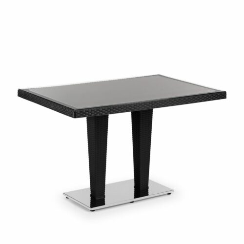 Großer, robuster Tisch mit Chrom-Doppelfuß und Rattanoptik – perfekt für Garten, Terrasse, Balkon und gastronomische Außenbereiche.