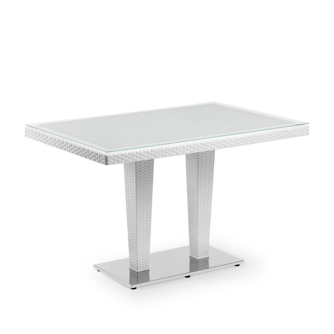 Der rechteckige Tisch ANTARES 80×120 CM mit doppeltem Chromfuß ist die ideale Wahl für alle, die auf großzügige Flächen und modernes Design setzen. Als größtes Modell der Antares-Serie bietet er ausreichend Platz für große Familien oder Gästegruppen. Dank seiner stabilen Bauweise mit rattanähnlichem Rahmen, wählbarer Tischplatte (Iroko oder Glas) und edlen Edelstahlfüßen bringt er Komfort, Stabilität und Eleganz in perfekte Balance – ideal für Garten, Terrasse, Balkon oder gastronomische Flächen.