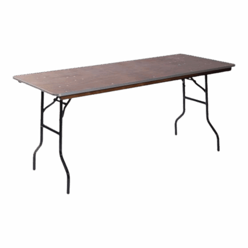 Vielseitiger rechteckiger Klapptisch aus Holz mit schwarzen Gestell und Multiplexplatte. Ideal für Transport, platzsparend. Passend zu Bankettstühlen.