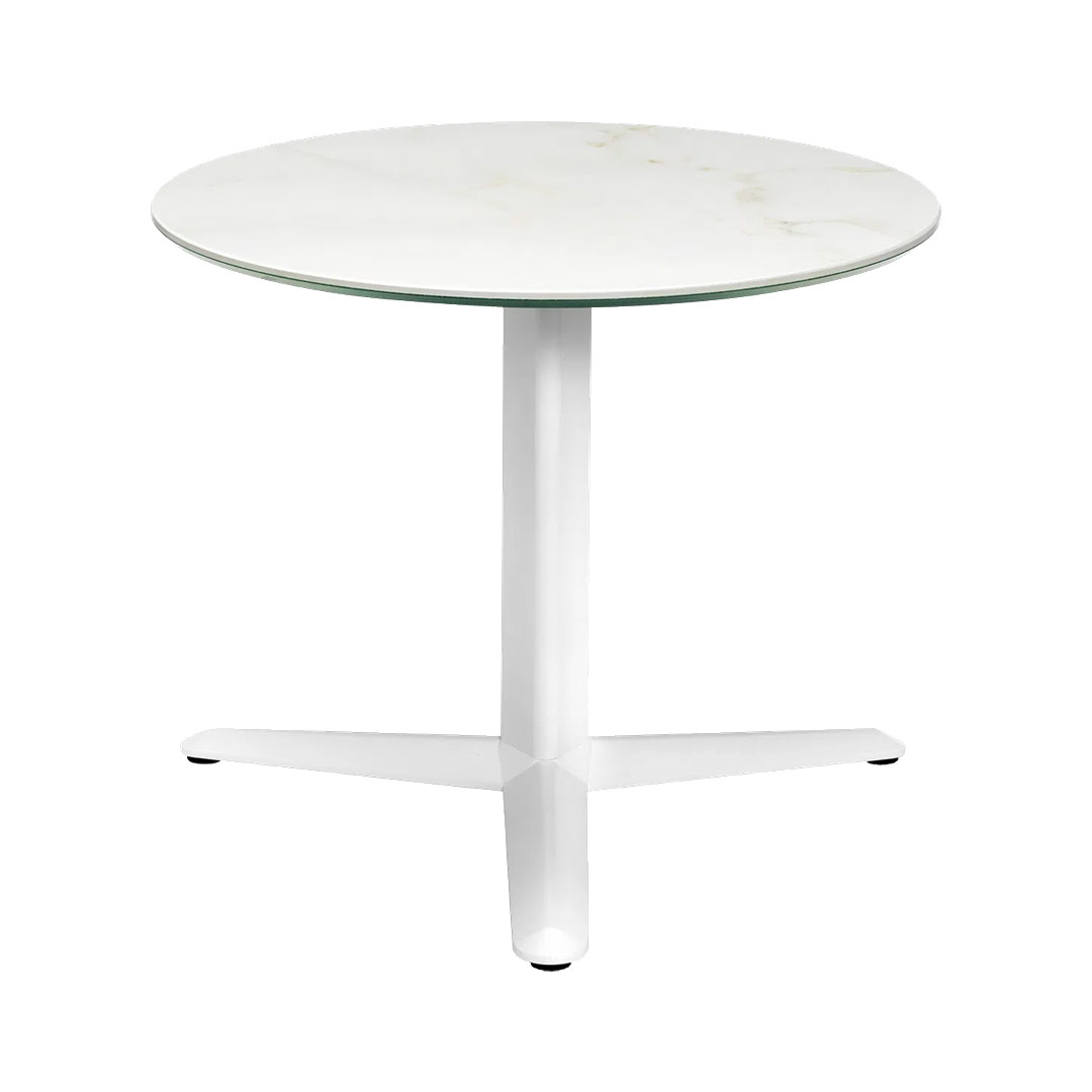 Der runde Tisch Arket ist in zwei Größen erhältlich: Ø 60 cm und Ø 70 cm, beide mit einer Höhe von 50 cm. Mit einer eleganten Porzellanplatte im Calacatta Gold Design und einem stabilen weißen Aluminiumgestell ist dieser Tisch die ideale Wahl für moderne und stilvolle Räume.