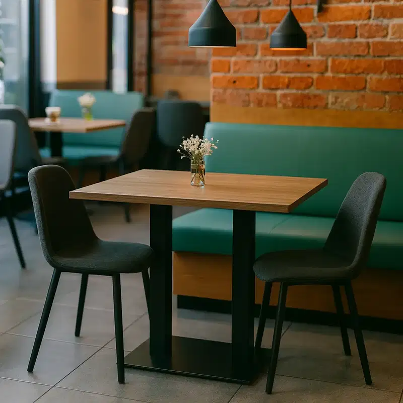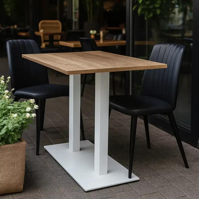 Die Tischplatten sind in verschiedenen modernen Holzdekoren wie Frappe Oak, Dark Walnut, Southern Walnut, Retro Wood, Sonoma Oak und Lyrical Oak erhältlich und fügen sich harmonisch in jedes Gastronomie-Konzept ein.
