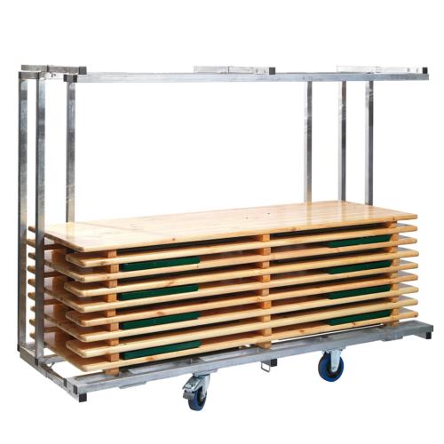 Je nach Größe der Garnituren können bis zu 6 komplette Sets (Tisch + 2 Bänke) auf dem Wagen gestapelt werden – das spart wertvollen Platz und erleichtert die Logistik bei Veranstaltungen.