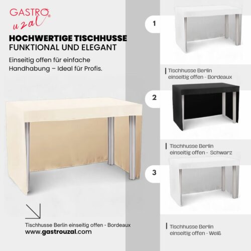 Verleihen Sie Ihren Veranstaltungen mit der Tischhusse Berlin einseitig offen in Ecru eine elegante Note – ideal für geschäftliche Treffen, Hochzeiten und festliche Anlässe. Verfügbar in vier Größen, pflegeleicht und langlebig!
