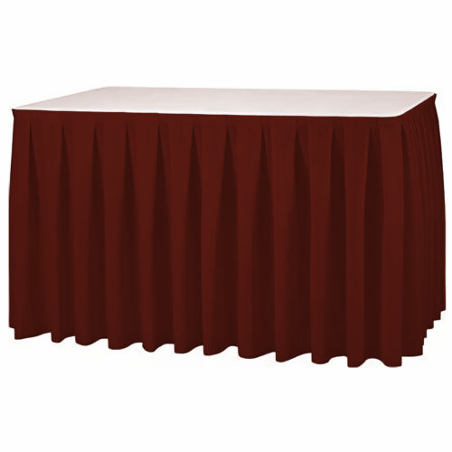 Das Skirting Excellent Kellerfalte Bordeaux B1 ist schwer entflammbar, elegant und ideal für stilvolle Tischverkleidungen bei professionellen Events.
