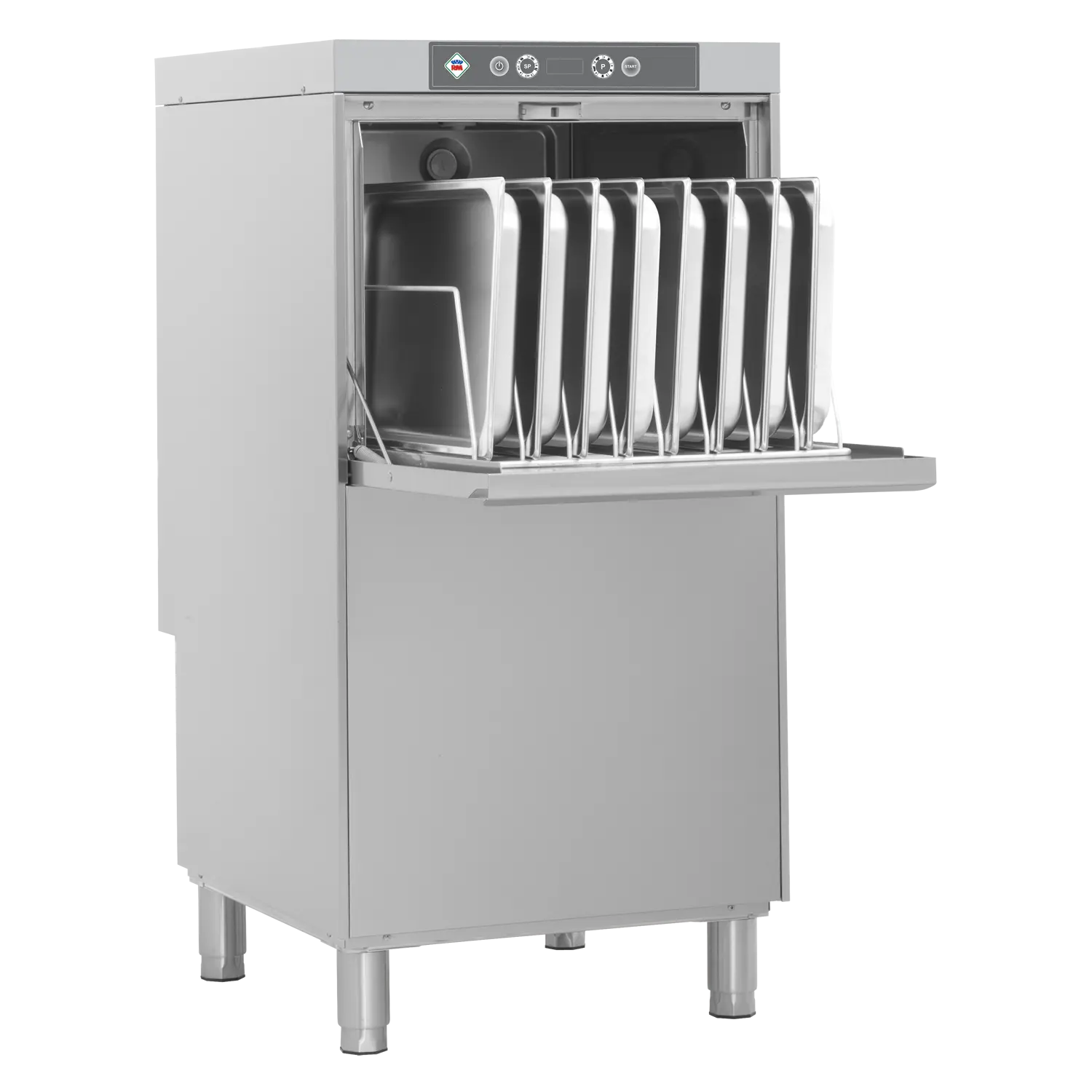 Standardausrüstung für das Gerät: Korb 500 x 600 mm; Der Edelstahleinsatz für GN ist nicht Bestandteil der Spülmaschine;