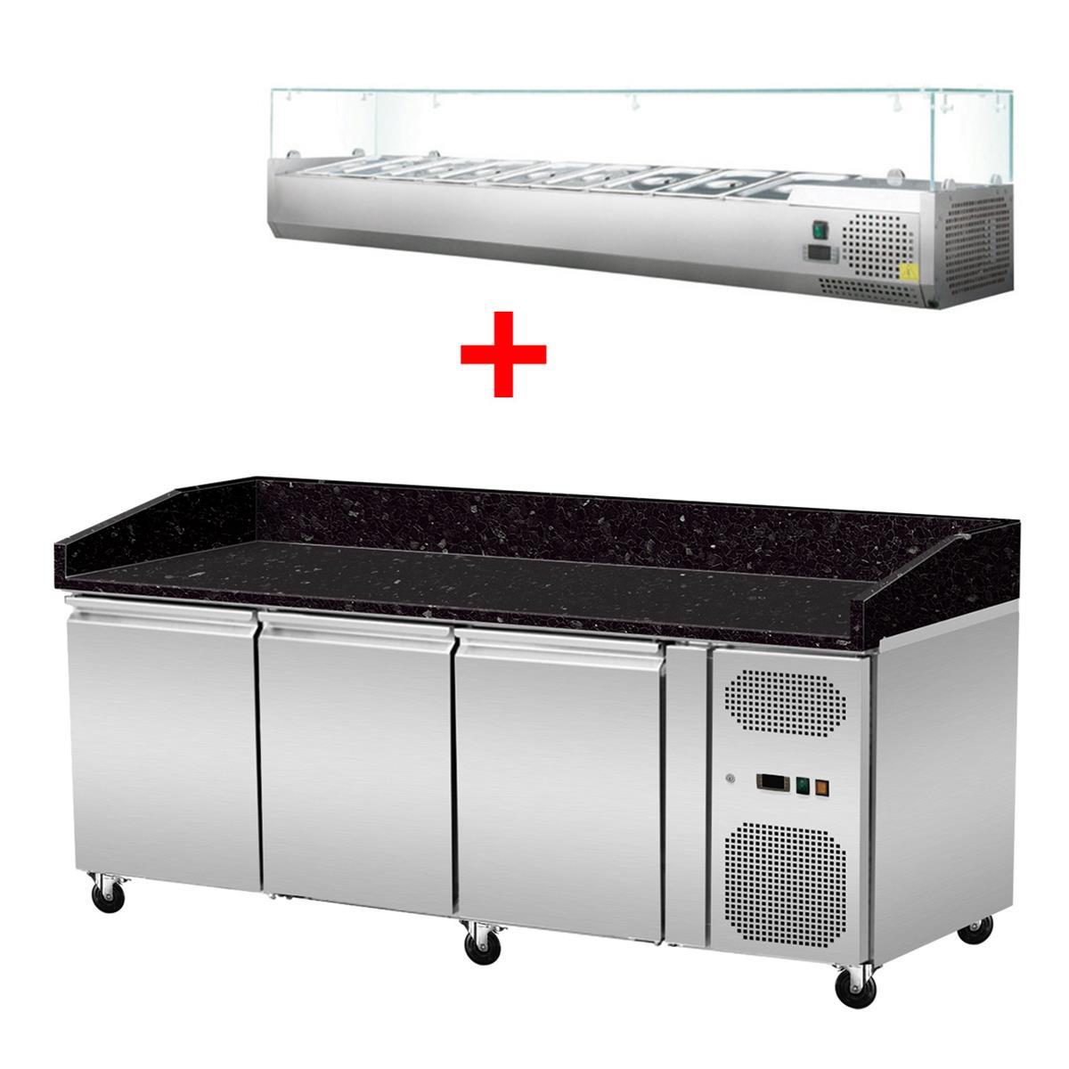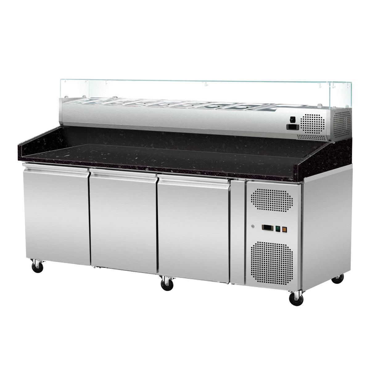 Pizza Kühltisch, Granit Star Galaxy schwarz, 3 Türen, 203 x 80 Kühlaufsatz GN1/3 mit Glas