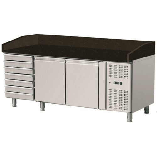Pizza Kühltisch mit schwarzer Granitarbeitsfläche, 2 Türen, 7 ungekühlten Schubladen und digitalem Thermostat.